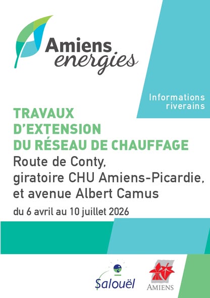 - Travaux d’extension du réseau de chauffage – Route de Conty – Du 6 avril au 10 juillet 2026Du 6 avril au 10 juillet : travaux d’extension du réseau de chauffage. Calendrier à consulter : https://www.rezomee.fr/amiens-energies/actu/travaux/travauxchu?preview=C%2FEpZmMvuIMLsAVf0OOLIgoMKwpA%2FoW3eydRqlolNCg%3D